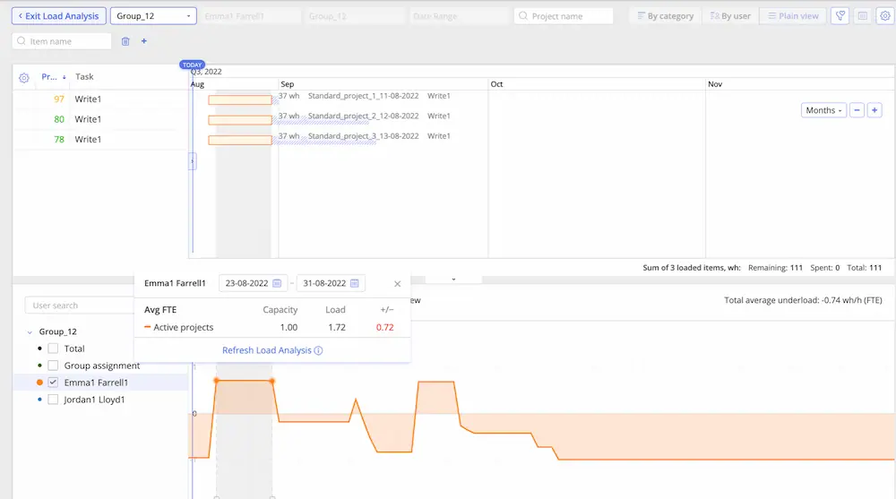 The load created by the inactive projects is presented by the dashed line on the graph. All necessary calculations are presented in the Load Analysis box. As you can see, we’re lacking 0,51 FTE with the active projects running together, and if we initiate the inactive projects, the figures will increase to 0.92 FTE. This means that we don’t have enough capacity in the selected group to cope with the demanded scope of work.  If details of the inactive project are available, you can check what tasks are expected to overwhelm your resources and take measures (move milestones, reassign tasks, or hire extra resources) to avoid the bottleneck.
