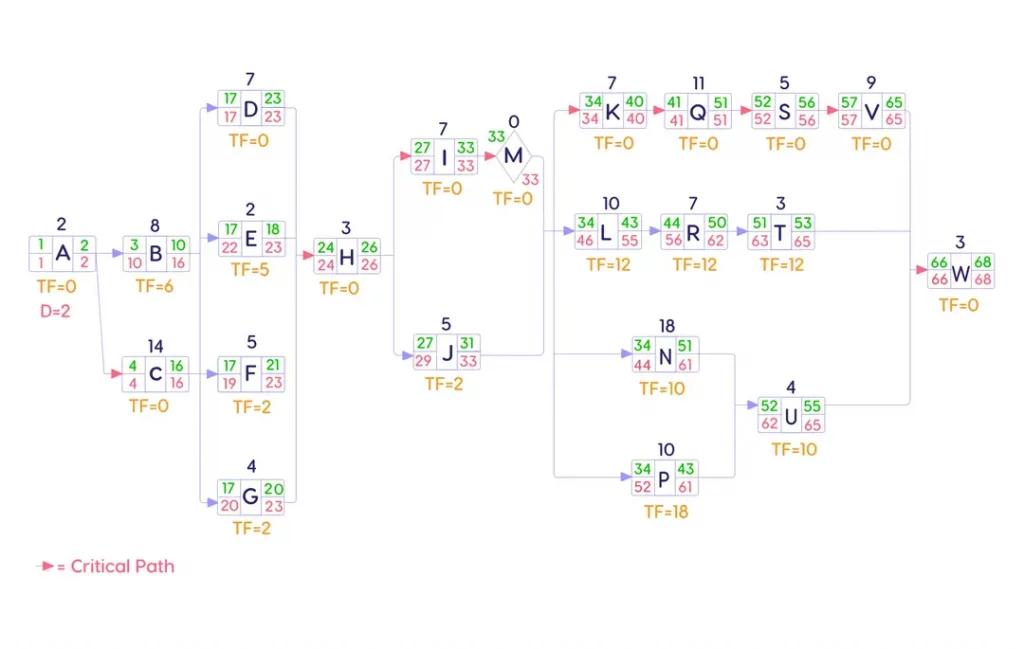 The drag calculation shows that Activity Q is adding 10 days to the project, more than any other task. Shrink Activity Q’s duration from 11 days to zero and its path (K-Q-S-V) would be 11 days shorter, at 21 days. The second longest parallel path, N-U, has a duration of 22 days, and so would now become the critical path with the drag of 1 day. Each activity on the path K-Q-S-V would now have a total float of 1 day. And the project would be completed 10 days earlier, on Day 58. That is why Q had 10 days of drag – it was adding 10 days to the project duration.