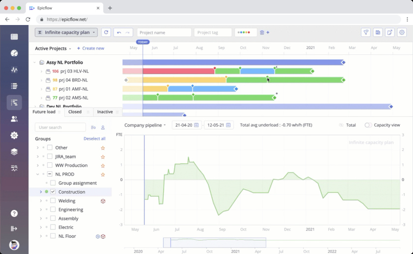 Epicflow helps forecast and reveal bottlenecks – their timely detection protects the workflow from bigger problems like project delay and cost overrun. Forecasting future capacity and workload helps plan resources for upcoming projects – it helps bridge the resource demand with the available capacity.