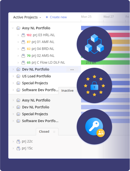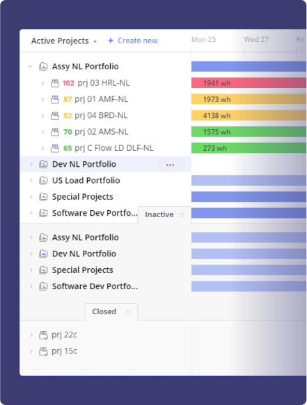 You have a bird’s eye view of the entire multi-project environment including active, inactive, and completed projects together with all processes, resource-related data, and essential parameters that provide insight into the state of your project portfolio from a single place.
