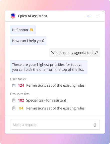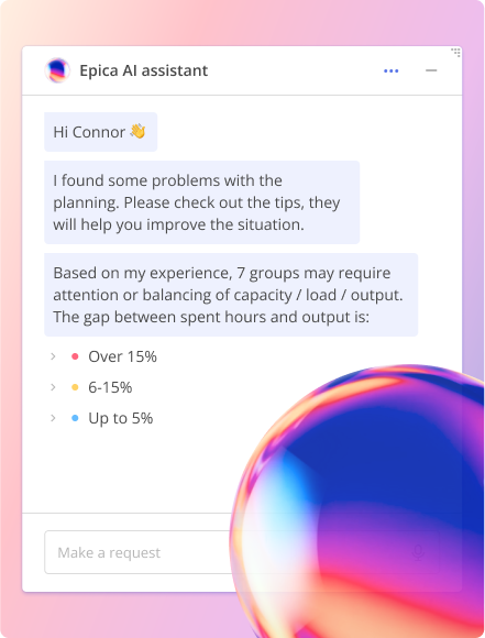 With Epicflow virtual assistant, you always have a reliable helpmate to ask project-related questions, get prompts, warnings, and calculate the most optimal days for a vacation. Epicflow is ideal project management software for IT companies as it offers everything you need and a little bit more.