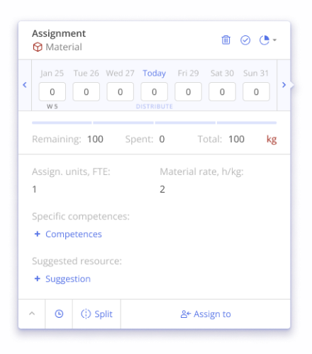 Add and manage information about production materials (measure, material rate, price, group rate, and group risk factor) and track their consumption.